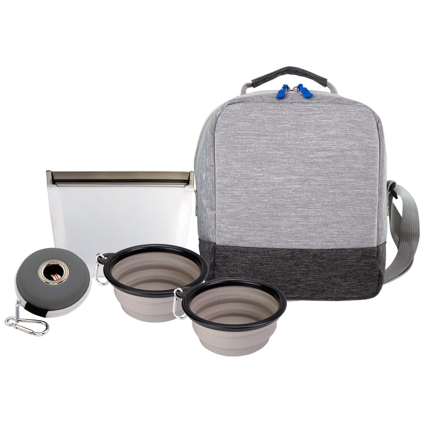Introducing the Bay Handy Cooler Bag featuring vibrant zipper pulls for a pop of color. Pair it with our set of two Pet Bowls complete with a convenient carabiner for on-the-go adventures. Never be without waste bags with our stylish Doggie Bag Disc Dispenser. Need a place to store your pet’s treats or dry food? Look no further than our spacious Large Smoke Reusable Food Storage Bag. Make feeding your furry friend a breeze with these high-quality accessories. Complies with FDA, Prop 65. 8″ L x 8.5″ H x 7″ W