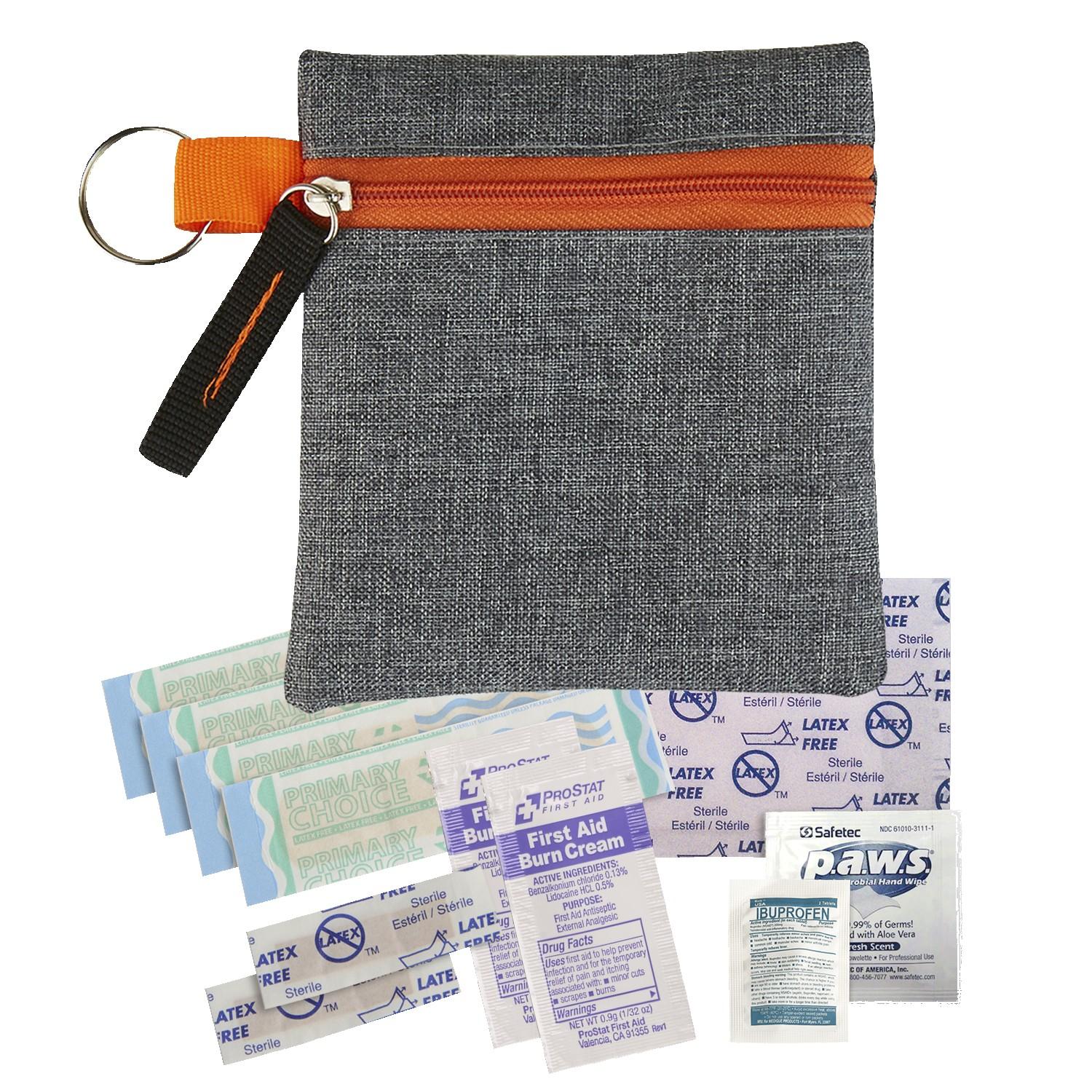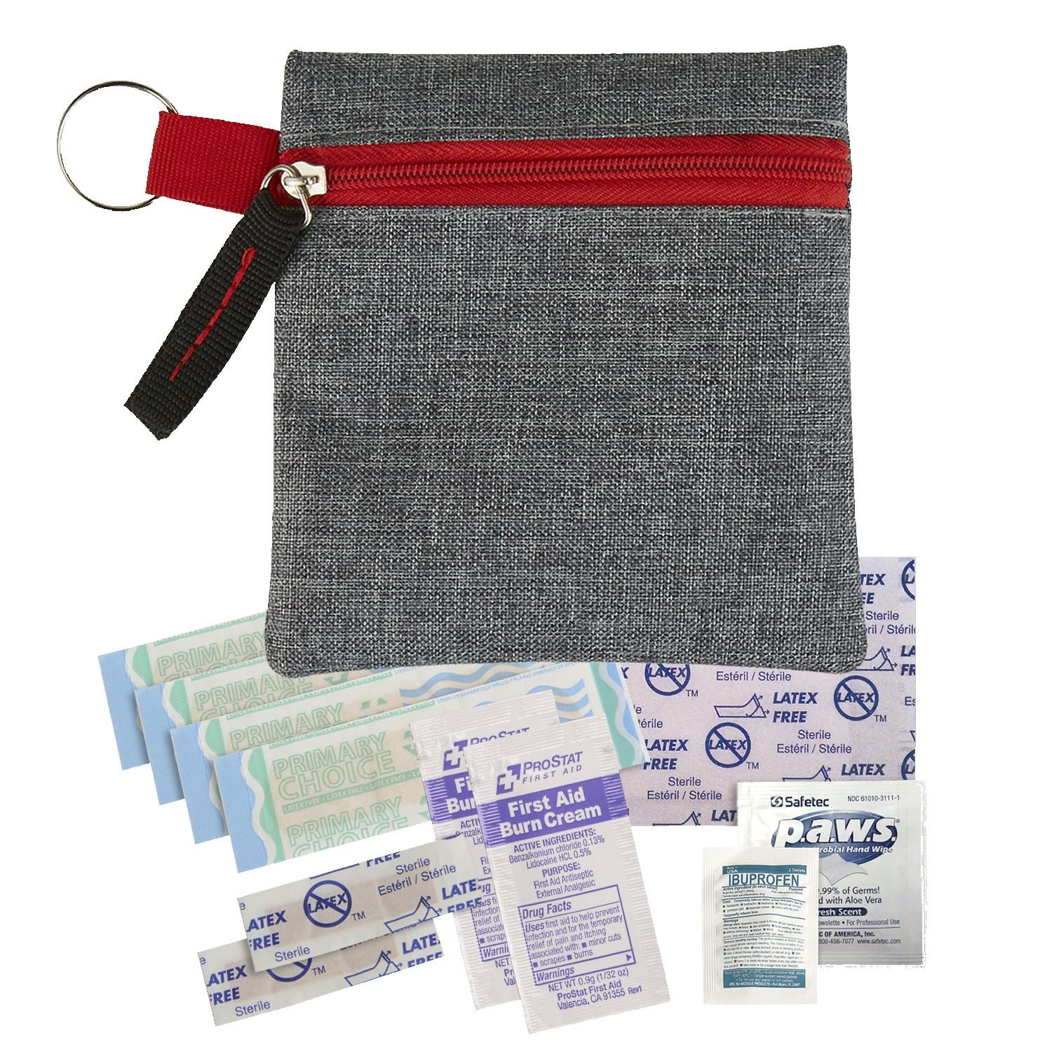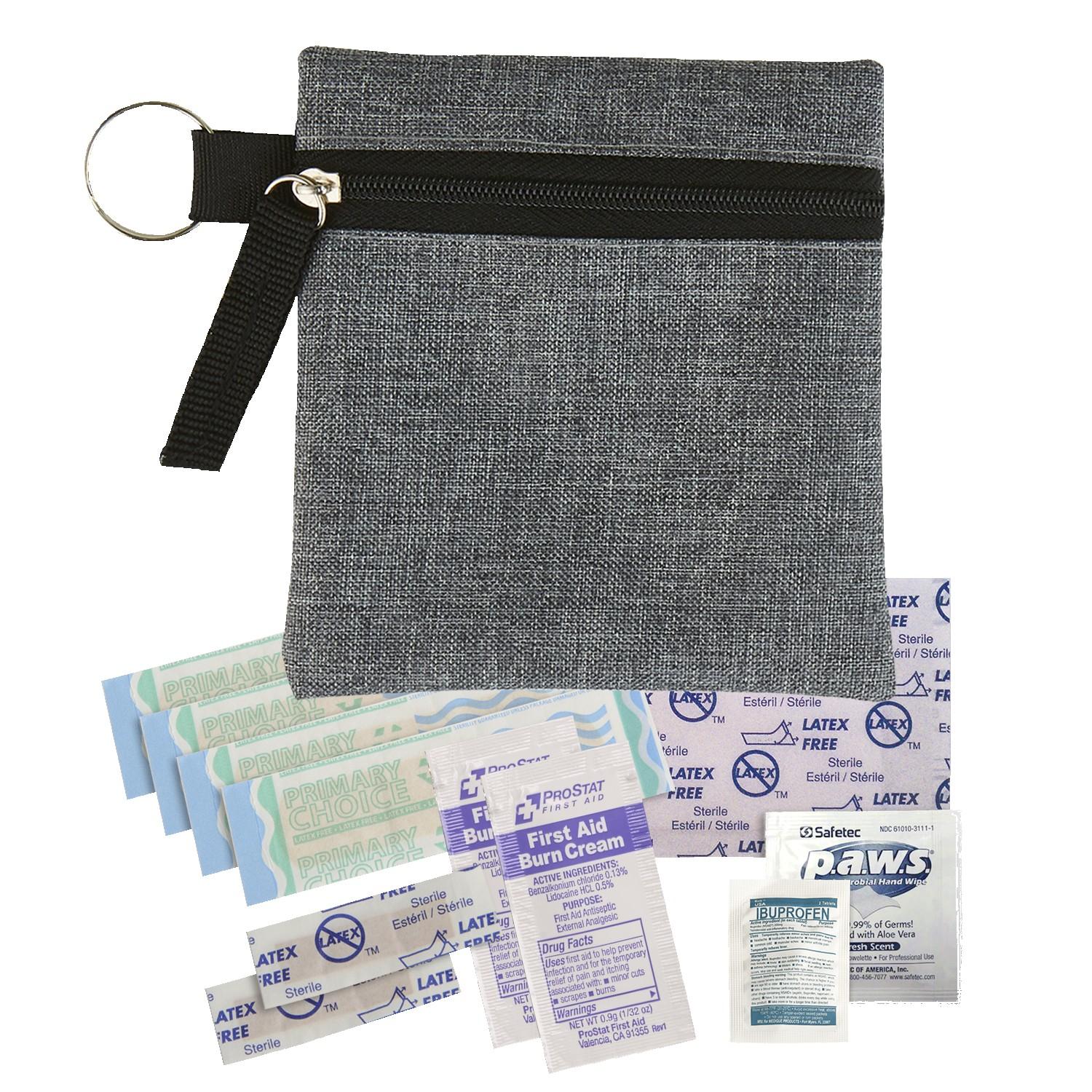 This heathered first aid kit includes 4 latex free bandages, bandages, 2 snip bandages, 2 first aid cream packets, a PAWS towelette, a 200 mg Ibuprofen packet and a (2″x 3″) adhesive pad. 4 1/8″ H x 4″ W x 1/4″ D