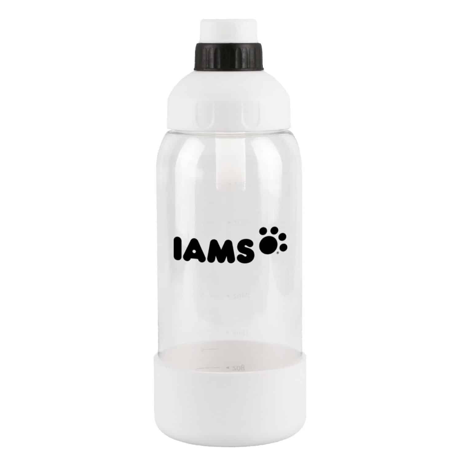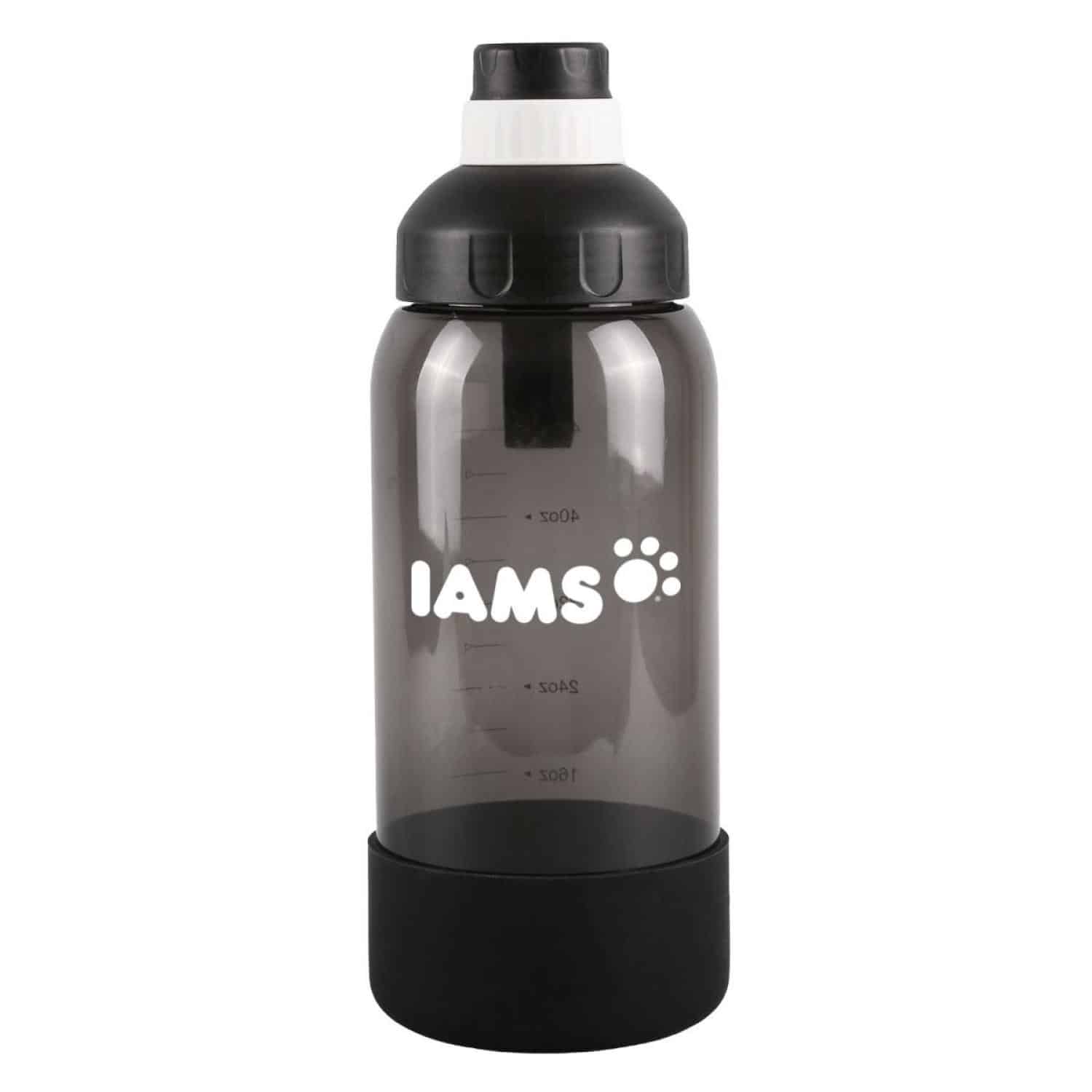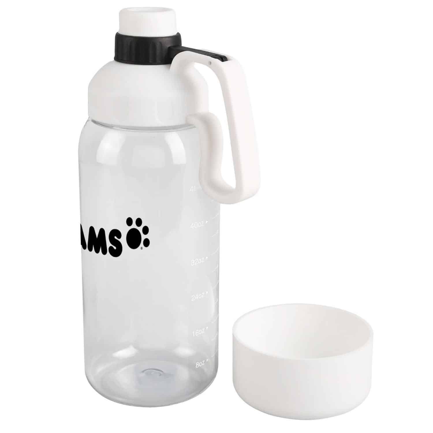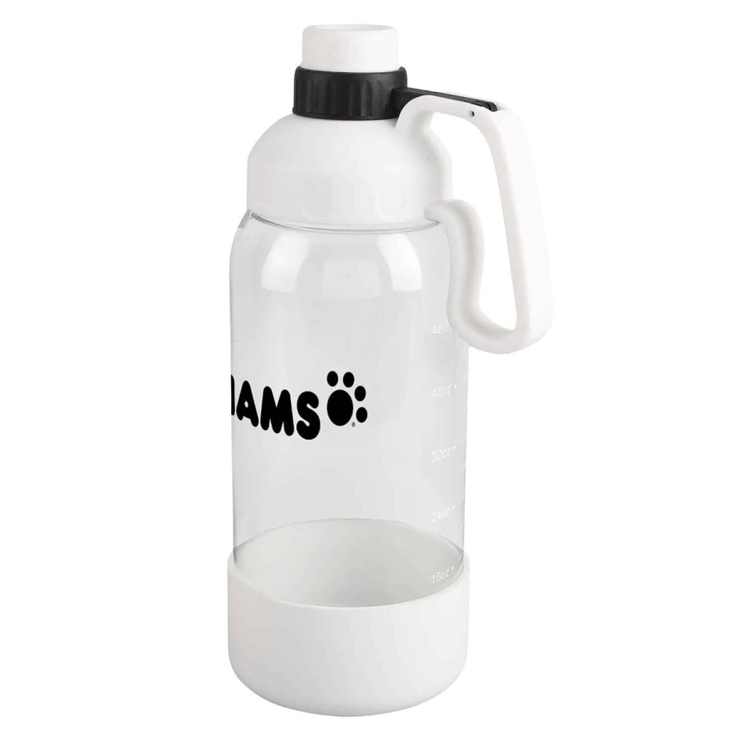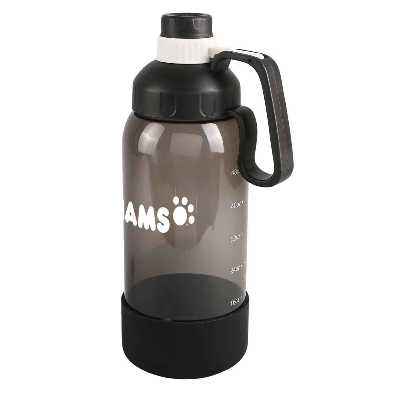 This bottle is marked up to 48 oz. but holds 60 oz. when filled to the top. It s made from impact- and shatter-resistant Tritan™ material and features a screw-on cap with a handle. You can pour water directly into the silicone pet bowl on the bottom. It meets FDA requirements, is BPA-free, and hand wash is recommended. 12″ H x 4 1/4″ Diameter